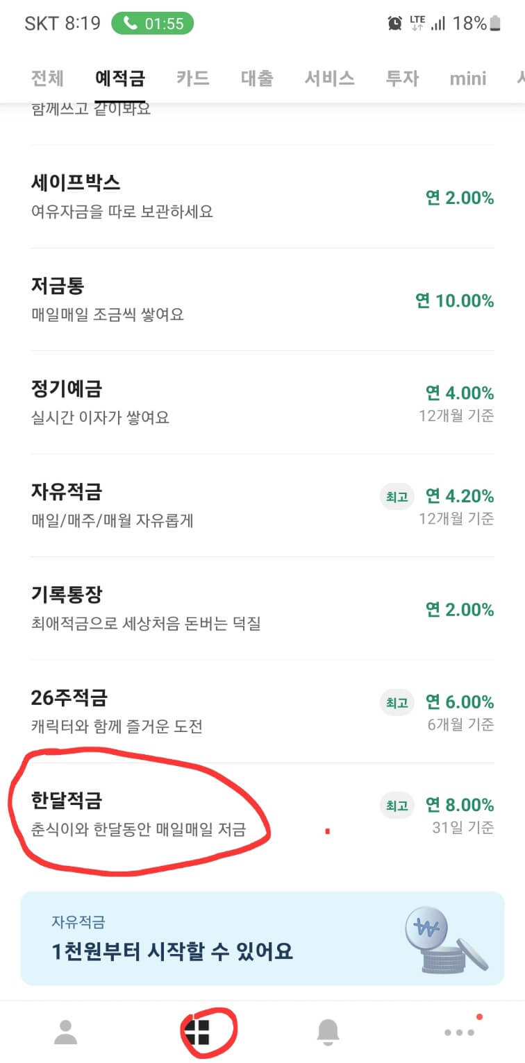 ✅ 카카오톡은행앱을 열고 메뉴에 예적금에서 한 달 적금을 선택합니다.
