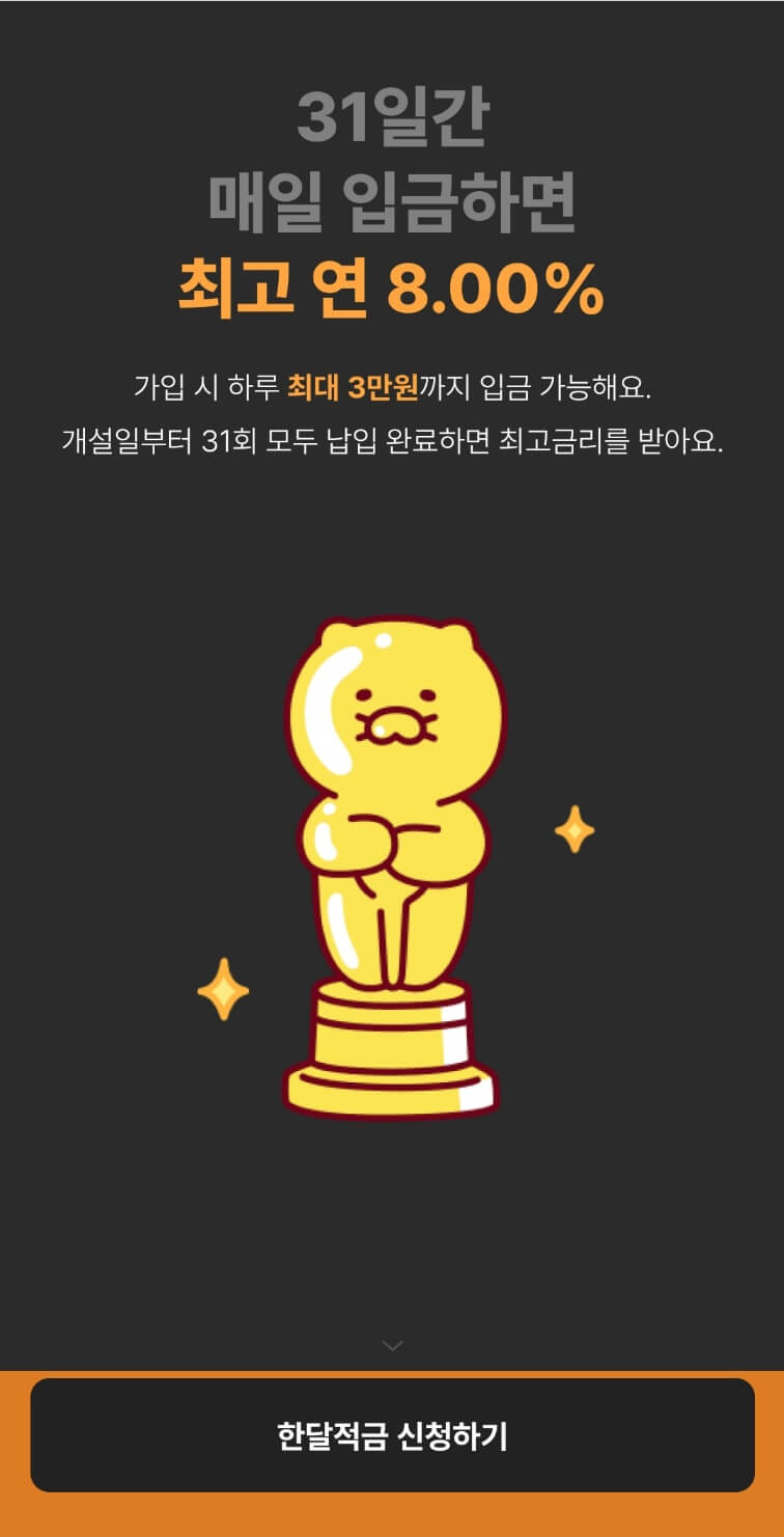 정부지원 자격이 되지 않아도 여러 적금상품들을 잘 체크만 한다면 충분히 큰 혜택을 볼 수 있습니다. 오늘은 그 중하나인 카카오뱅크에서 나온 한 달 적금에 대해 알아보겠습니다. 이자가 8%나 된다고 하니 웬만한 정부지원적금이 5%~6%이니 충분히 좋은 적금입니다. 간단하게 가입방법에 대해 알아보겠습니다.